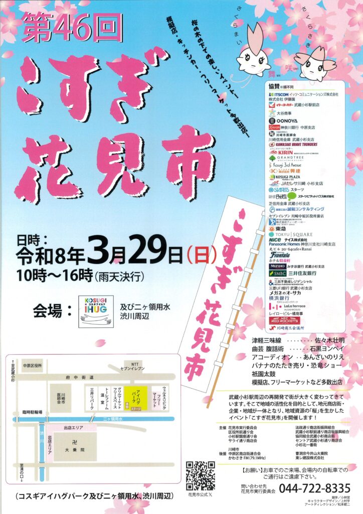 3/29(日)武蔵小杉 第46回こすぎ花見市 再開発で大きく変わってきている武蔵小杉の街の活性化を目的として、地元商店街・企業が開催する桜がテーマのイベントです。飲食店のブース出店や、フリーマーケット。ステージでは津軽三味線やアコーディオンなども登場します